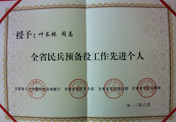 2013年6月18日 ,,,,在兰州宁卧庄宾馆召开了全省民兵准备役事情聚会 ,,,,聚会总结“十五”以来我省民兵准备役建设 ,,,,安排以后一个时期的重点事情 ,,,,表扬奖励了全省准备役事情的先进单位和先进小我私家。。。省向导王三运、刘伟平、欧阳坚、李建华、王玺玉及省政府秘书长张生桢出席聚会。。。步队向导王文清、李建印、陈知庶、傅传玉、李勇、李林出席聚会。。。集团公司党总支书记、副总司理叶长林荣获全省民兵准备役事情先进小我私家声誉称呼。。。