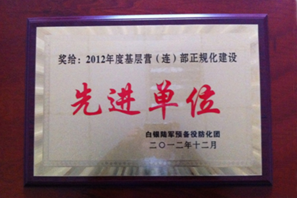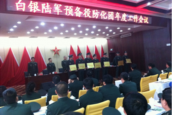 在2013年2月28日上午召开的“白银陆军准备役防化团年度事情聚会”上,,由xh6388新濠天地公司在编的白银陆军准备役防化团三营八连被评为“2012年度下层营(连)部正规化建设先进单位”。。。。白银军分区司令员封庆祝、市委副书记、组织部长、防化团第一政委宋奋吉出席聚会并讲话,,聚会由防化团团长催碧宏主持。。。。集团公司党总支书记、防化团三营副营长叶长林加入聚会并领奖。。。。