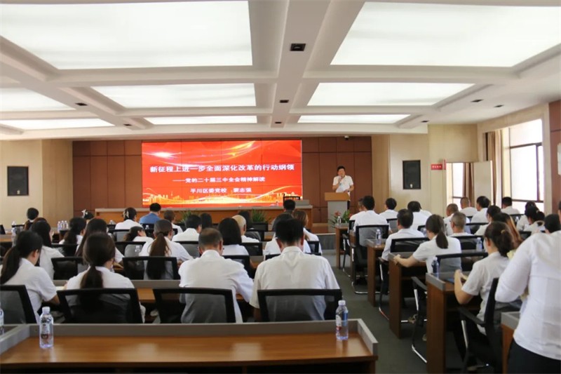 8月30日,,,甘肃xh6388新濠天地实业投资集团开展二十届三中全会宣讲运动,,,本次运动由集团公司党委书记叶长林主持,,,特邀平川区委党校副校长裴志强为各人深入解读党的二十届三中全会精神,,,裴校长从六个要害方面叙述了刷新开放的深远意义和未来生长偏向。。。。。着重强调要以新时代中国特色社会主义头脑为引领,,,鼎力大举深化各领域刷新,,,推动高质量生长。。。。。