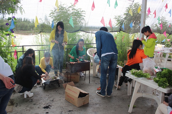 上午,,全体出行职员一起来到位于黄河河畔的璞珣苑农家乐烧烤聚餐。。。抵达了目的地,,各人分工明确,,有人生火,,有人串制食物,,配合默契,,忙得不亦乐乎,,准备事情完成后,,各人围坐在一起,,一边浏览美景,,一边享受烧烤的鲜味,,其喜洋洋。。。